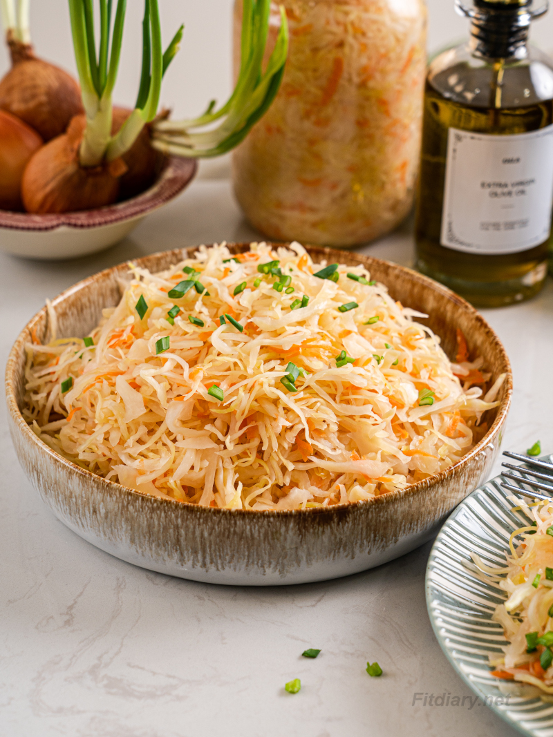 Served sauerkraut drizzled with olive oil and topped with chopped green onion as a healthy side dish