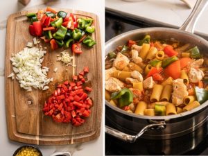 Chopped bell peppers, Roma tomatoes, diced onion and garlic added to the pot with chicken for making Southwest chiken pasta